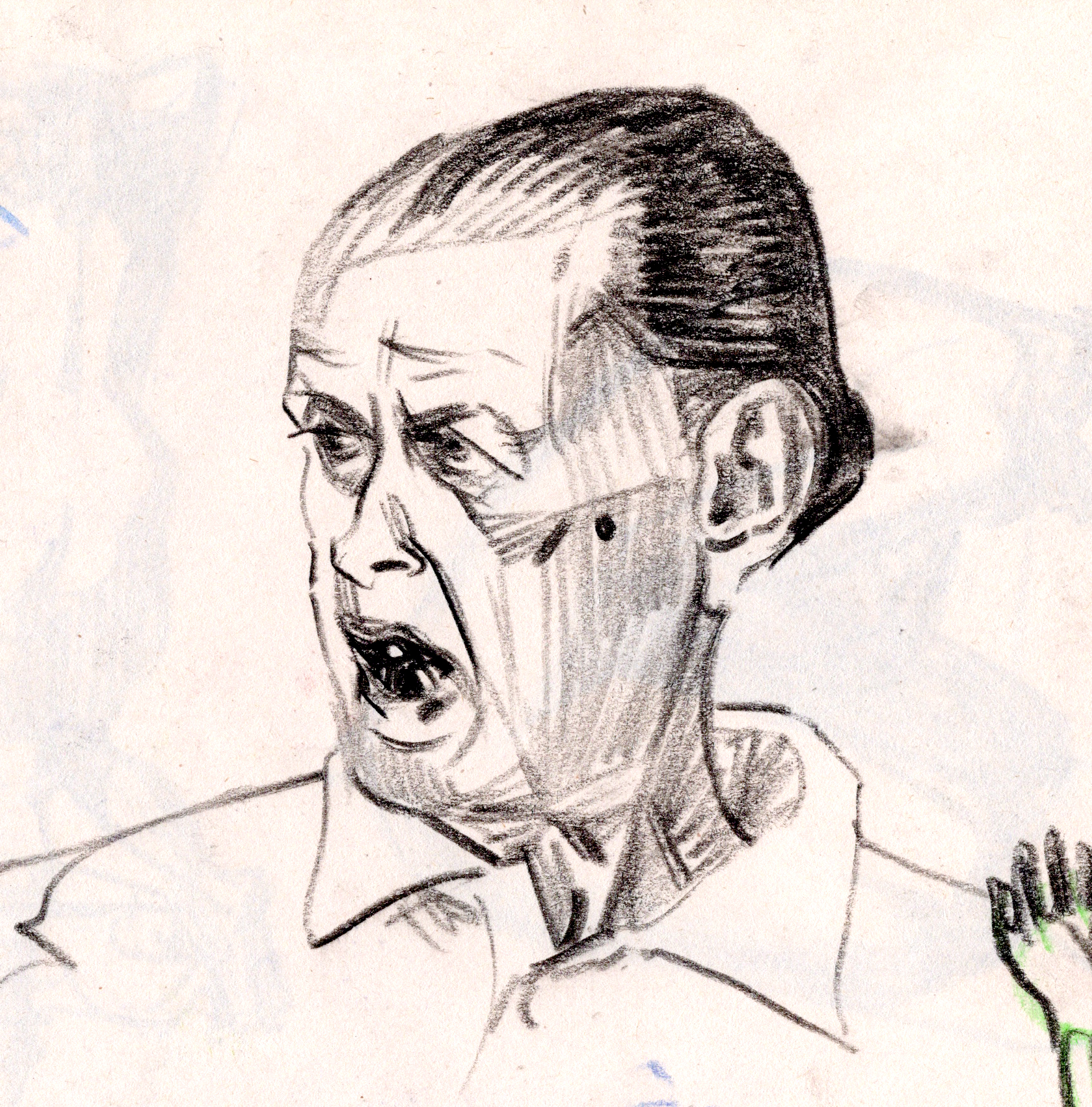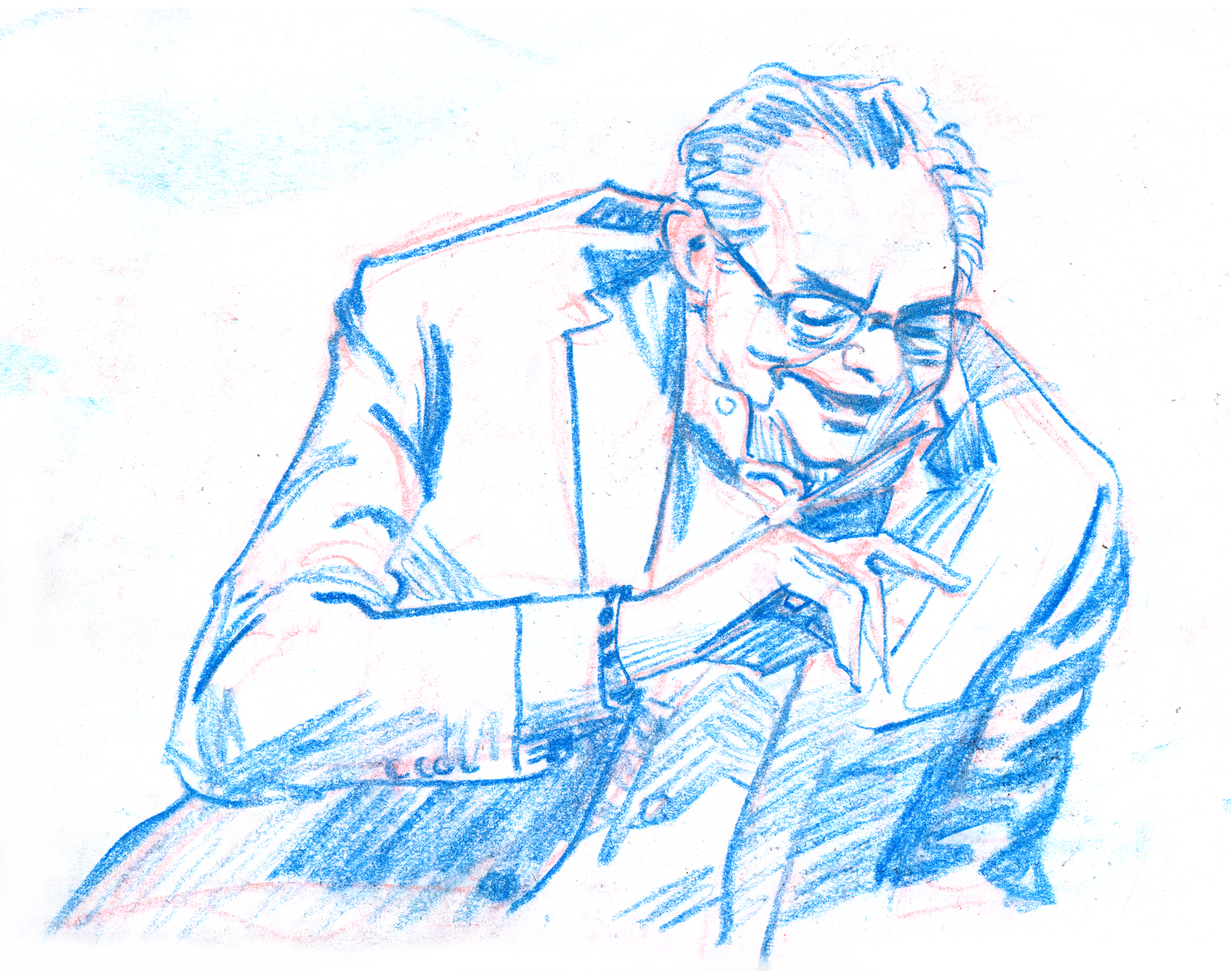 Sometimes people move in a beautiful way that I have to capture. I watched an interview with comedian Lewis Black on YouTube, and paused the video on single frames that characterized the range of Lewis’ body language. I drew from the frames while listening to clips of Lewis talking in order to infuse the drawings with his thoughts and intonation.