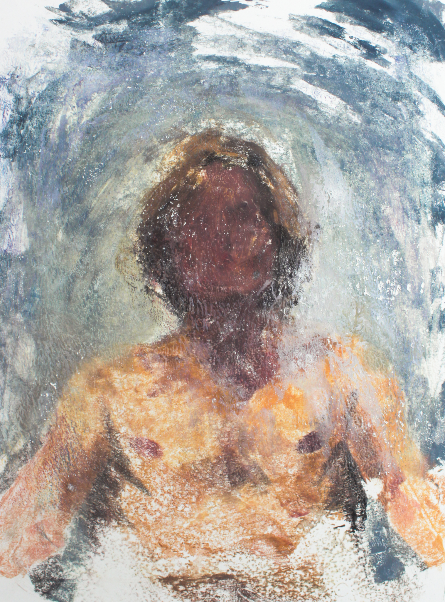 Made by leaning over a mirror and painting over my reflection onto the glass, then pressing paper onto the painted glass.
