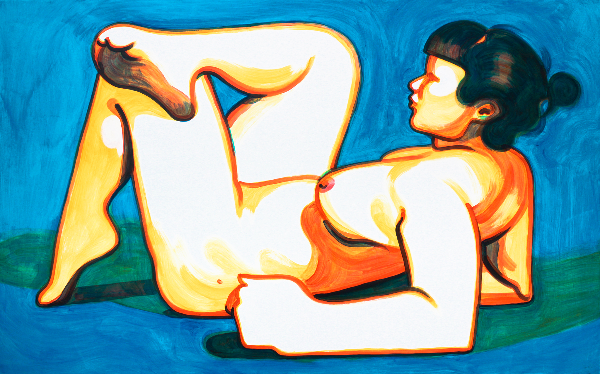 One thing I’m exploring with my nude paintings is the unsettling human contradiction of being both a subject and an object. In the case of Stellar Object, I depict a human body with simple, elegant curves and rich layers of primary colour to make a kind of beautiful ornament of molten glass. It doesn’t meet your gaze, just sits there like a hot ball of gas, but you can humanize it like we do the sun and stars because we know at some level we are made of the same stuff.