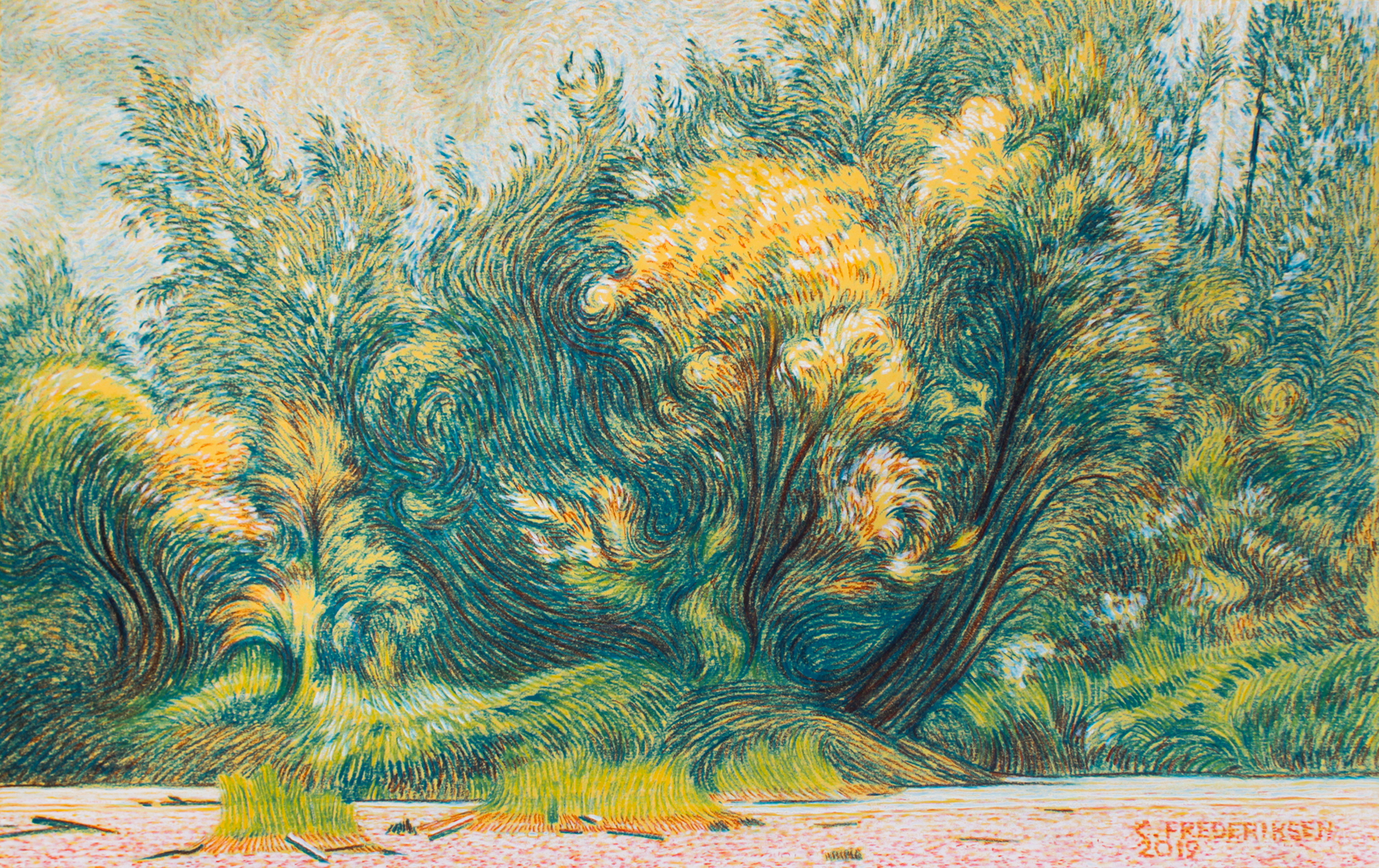 Developed from a drawing session done on location in northern Alberta. I was thinking of van Gogh and trying to reflect my emotional experience through mark-making and visual movement.