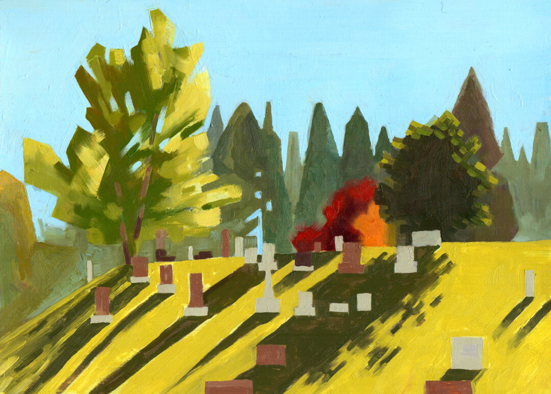 Painted on location at McHugh Bluff. This shows a large walled-in property overlooking Sunnyside, surrounded by woods. It’s a spot that’s always held mystery for me.