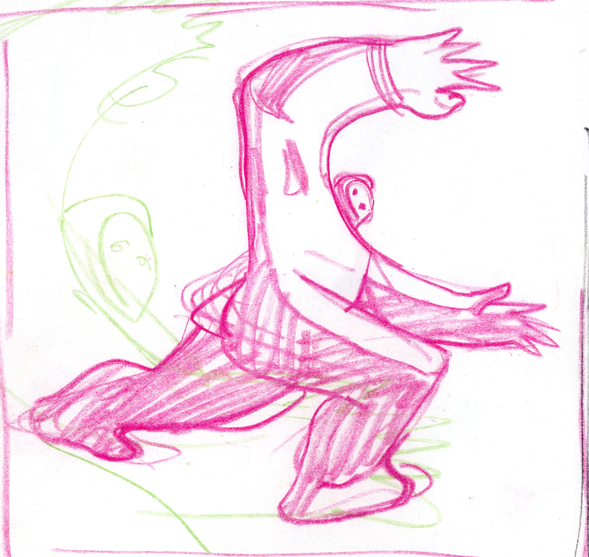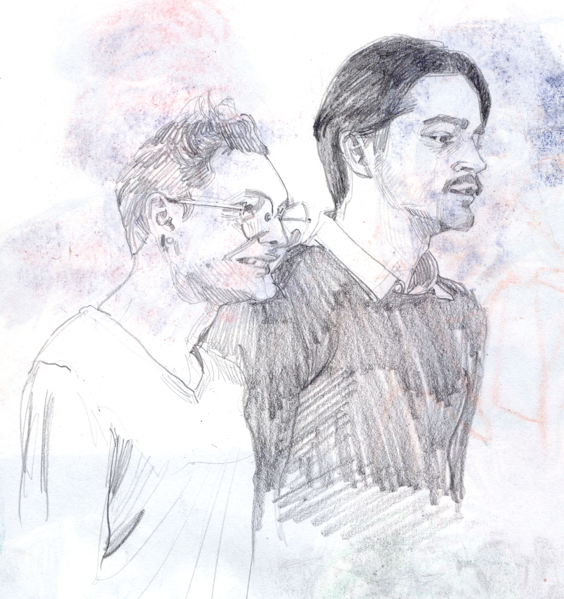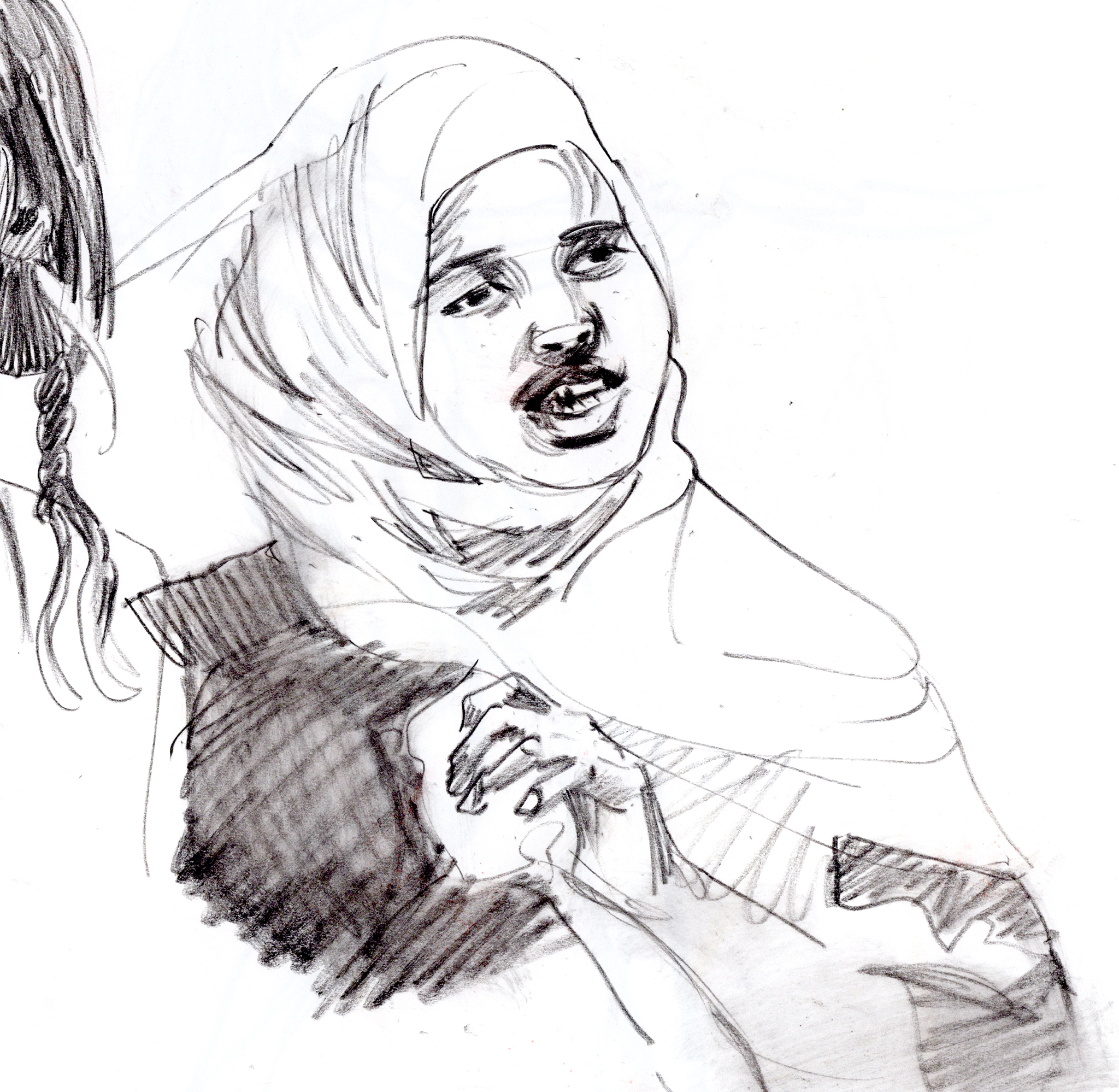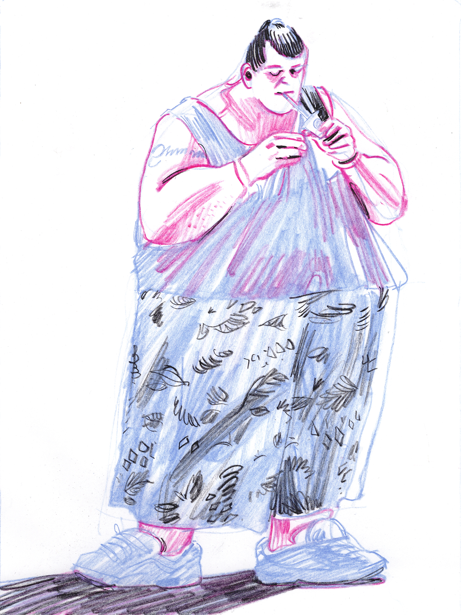 I used a still image from a low quality video as reference. I found it an interesting challenge to translate motion blur and digital artefacts into an analog drawing.