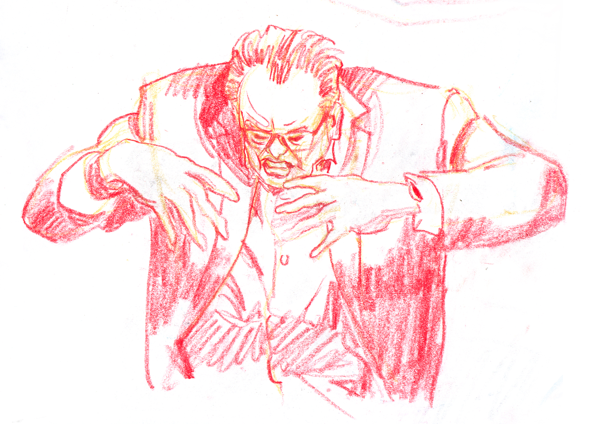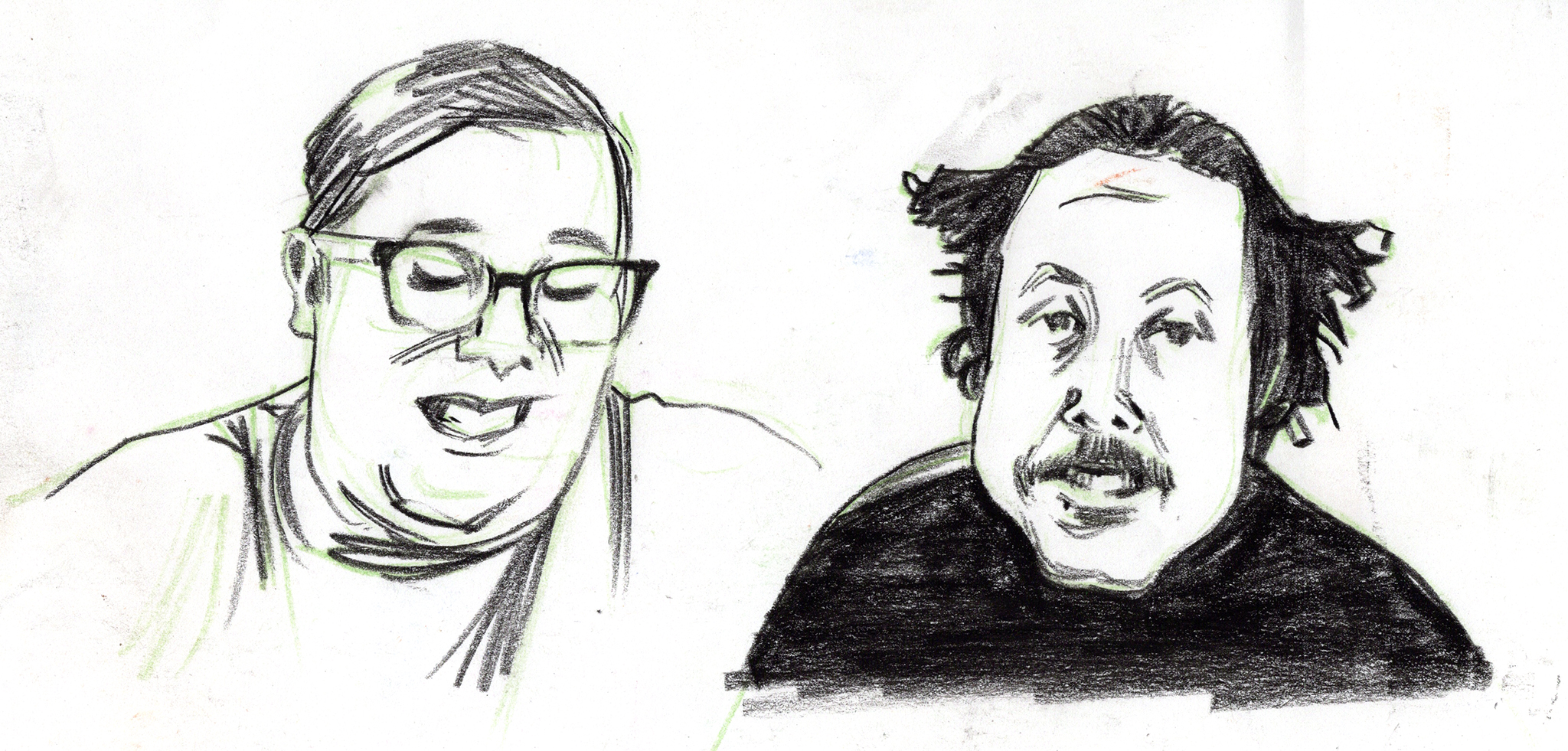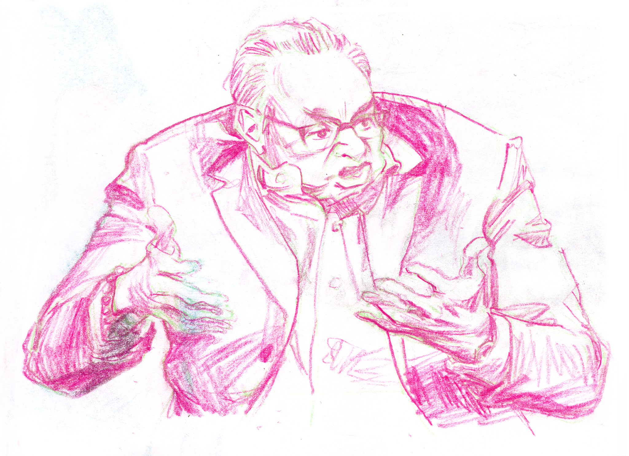 Sometimes people move in a beautiful way that I have to capture. I watched an interview with comedian Lewis Black on YouTube, and paused the video on single frames that characterized the range of Lewis’ body language. I drew from the frames while listening to clips of Lewis talking in order to infuse the drawings with his thoughts and intonation.